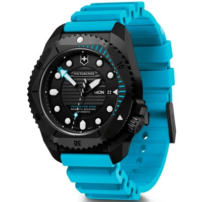 Este relógio Victorinox tem uma caixa de Titânio com um diâmetro de 43 mm e está equipado com uma bracelete de borracha. A caixa possui um movimento Sellita e o relógio tem um vidro Safira anti-reflexo única.