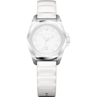 Esta bracelete de relógio Victorinox é feita de borracha e está fixada ao relógio através de pinos carregados por mola de liberação rápida. A bracelete tem uma largura de 16 mm e fecha através de fivela dobrável com botões de pressão. A bracelete tem uma montagem a direito, o que significa que esta bracelete é adequada para todos os relógios Victorinox com montagem da bracelete a direito.