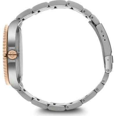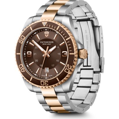 Este relógio Victorinox tem uma caixa de Inox com um diâmetro de 43 mm e está equipado com uma bracelete de metal. A caixa possui um movimento Ronda e o relógio tem um vidro Safira.