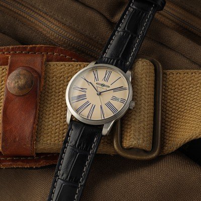Este relógio Zeppelin tem uma caixa de Inox com um diâmetro de 35 mm e está equipado com uma bracelete de couro. A caixa possui um movimento Ronda e o relógio tem um vidro K1 Mineral.