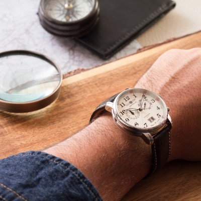 Este relógio Zeppelin tem uma caixa de Inox com um diâmetro de 40 mm e está equipado com uma bracelete de couro. A caixa possui um movimento Ronda e o relógio tem um vidro K1 Mineral.