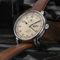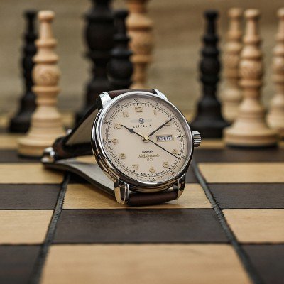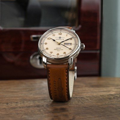 Este relógio Zeppelin tem uma caixa de Inox com um diâmetro de 40 mm e está equipado com uma bracelete de couro. A caixa possui um movimento Miyota e o relógio tem um vidro K1 Mineral.
